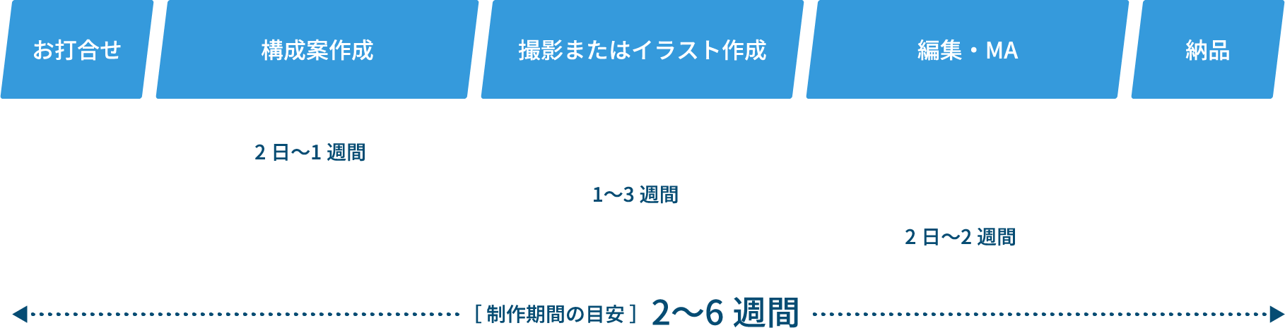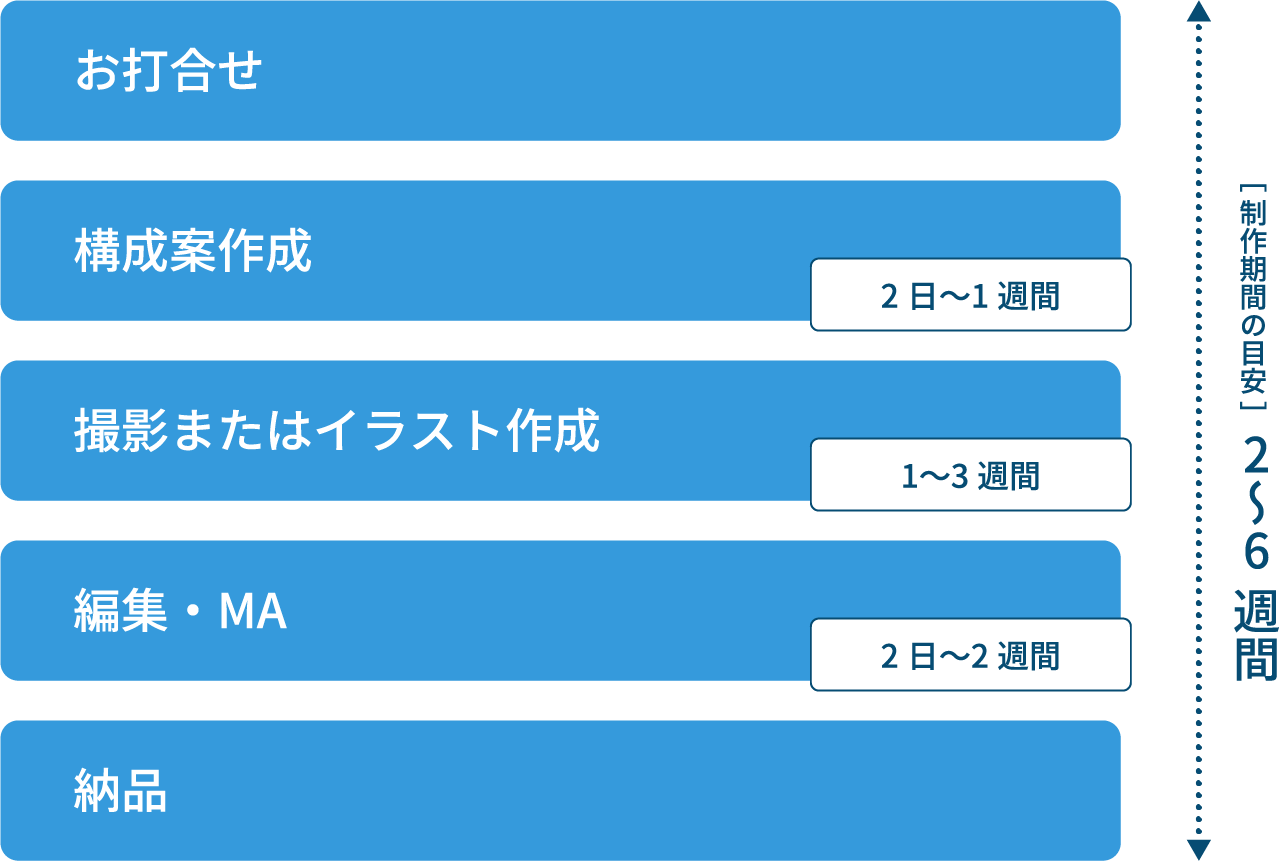 ※制作期間はクライアント様のご確認のタイミングや修正回数により、大きく変動いたします。まずはお気軽にお問い合わせください。