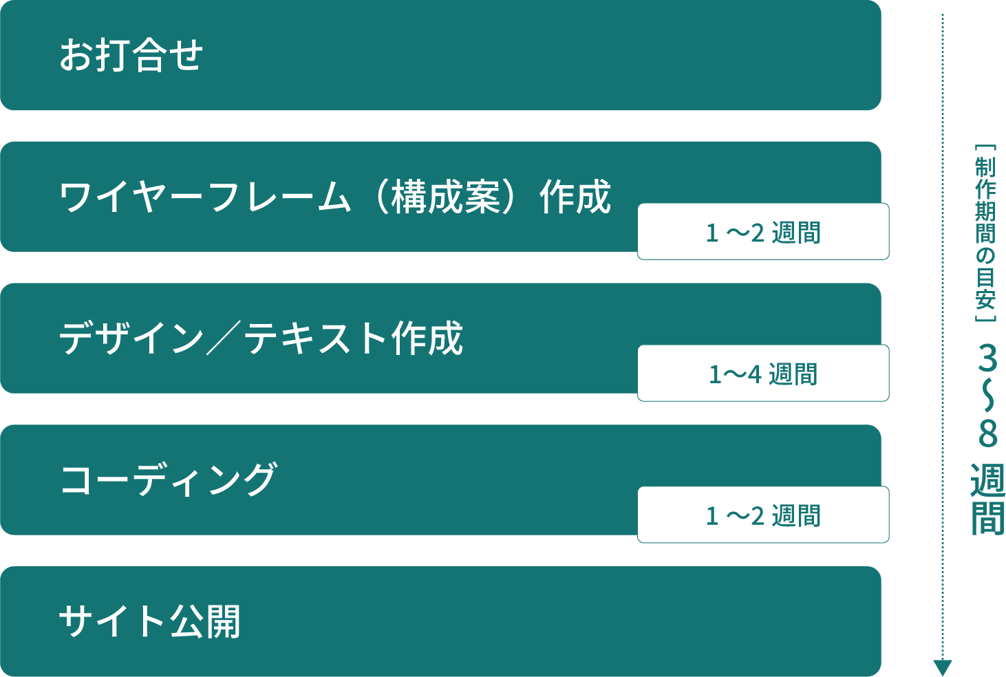 ワイヤーフレーム(構成案)の作成からサイトの公開まで、スムースに行けば1ヶ月程度でサイト公開できます。